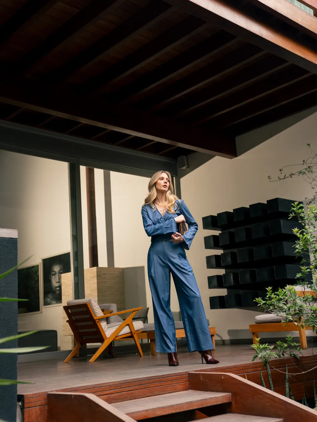 Pantalón denim holgado con pliegues para mujer, que ofrece una mezcla de comodidad y estilo. Los pliegues añaden una estructura única al diseño clásico del denim, creando una prenda que se adapta tanto a un look relajado como a uno más refinado.